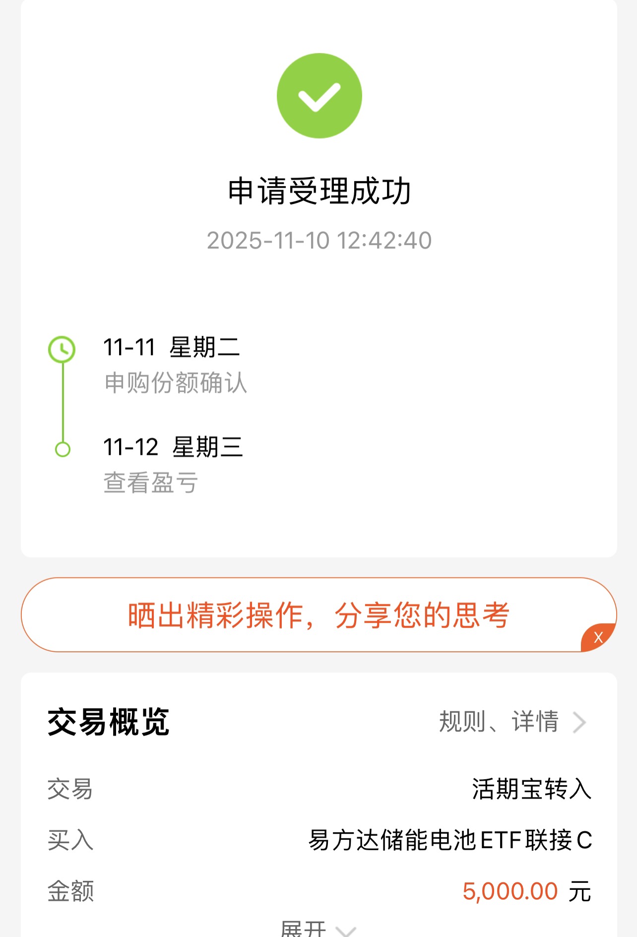 最近储能热度飙升,行业迎来政策+需求双驱动,景气度持续抬升。储能电池指数是全市场唯一一只专注储能赛道的指数基金,成分股覆盖从电芯、系统集成到下游应用的核心企业,赛道纯粹、弹性十足。今天趁着储能板块小幅回调,我果断建仓。短线调整反而是上车的好机会,布局一点仓位,等后续行情发酵,再看趋势加码!