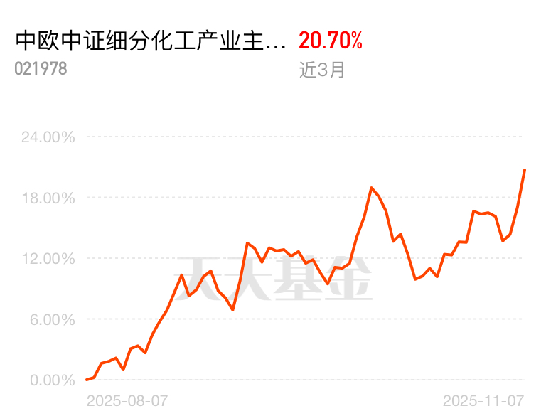 科技板块天天换热点,追得人身心俱疲,反观化工行业,涨价逻辑实打实,需求也在持续回升。中欧中证细分化工产业主题指数C近3个月涨20.70%,重仓优质企业,不用折腾,拿住就能赚钱。