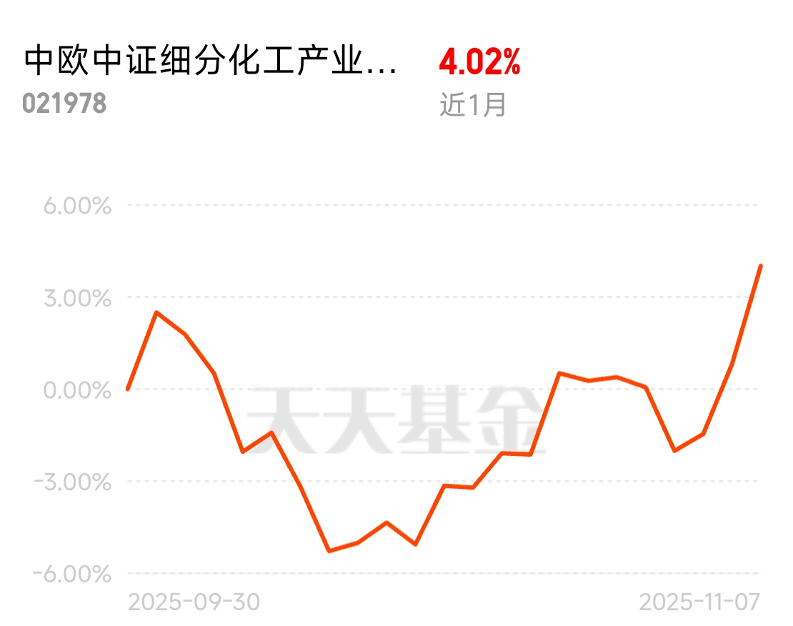 电池、光伏今天没什么热度,化工行业却因为原料涨价、利润改善涨得很扎实,还有政策支持。中欧中证细分化工产业主题指数C近1个月涨4.03%,有加仓红包,覆盖热门赛道,选对它比瞎追热点强。