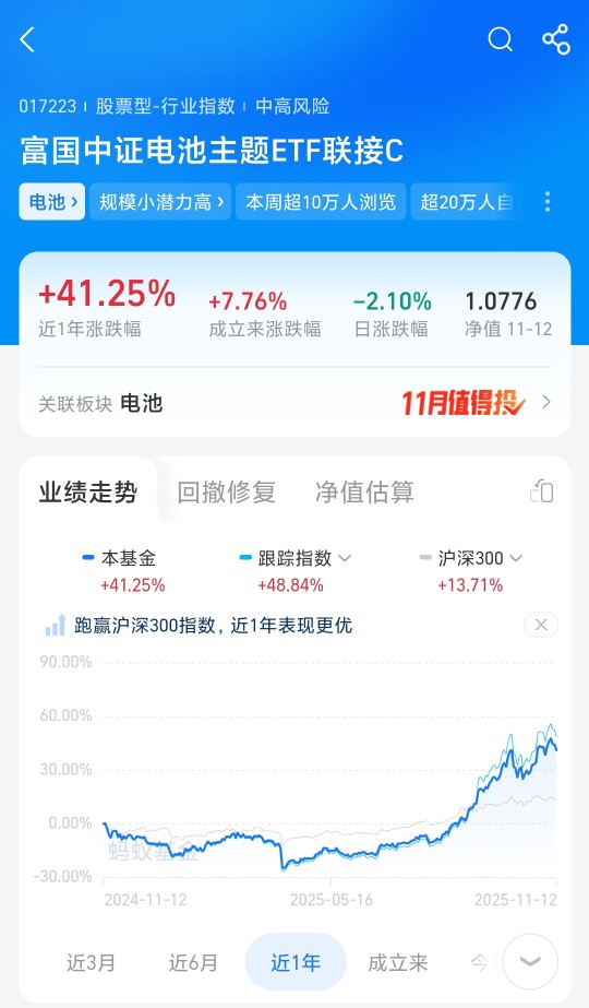 之前买进易方达电池ETF联接C,近期加了点富国中证电池主题ETF联接C,近6个月涨了63%,跑得稳大多数同类,产业里算亮眼的。