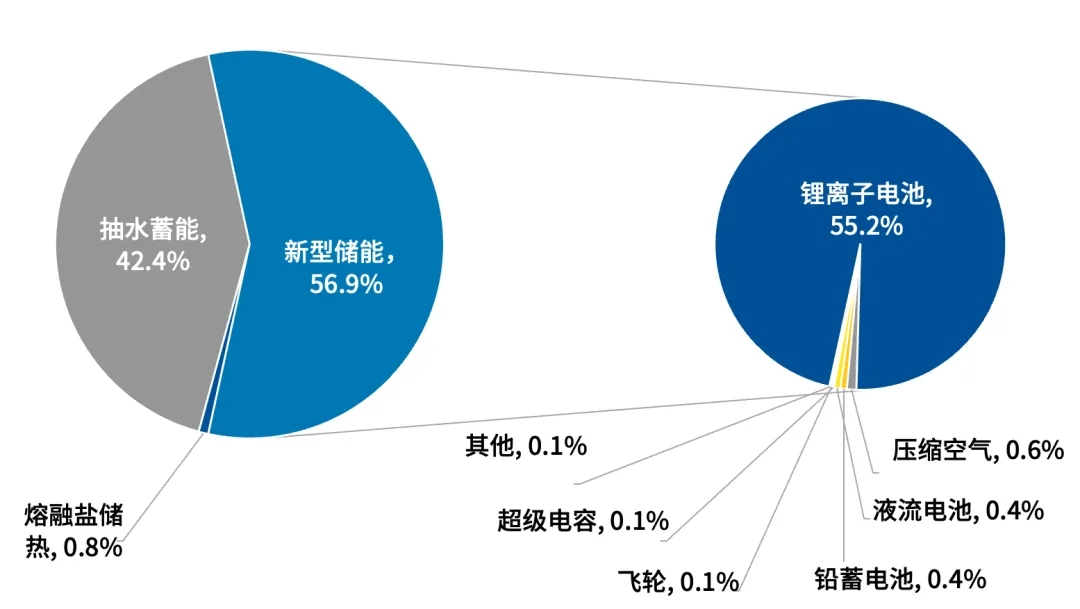 在历史上的很长一段时间里,抽水蓄能曾一度占据储能市场的主导地位。随着新型储能技术的不断成熟和应用,到了2024年,我国新型储能的累计装机量首次超过抽水蓄能,占比达56.9%,其中绝大部分是锂离子电池,累计装机规模占新型储能的97%,占总储能的55.2%。