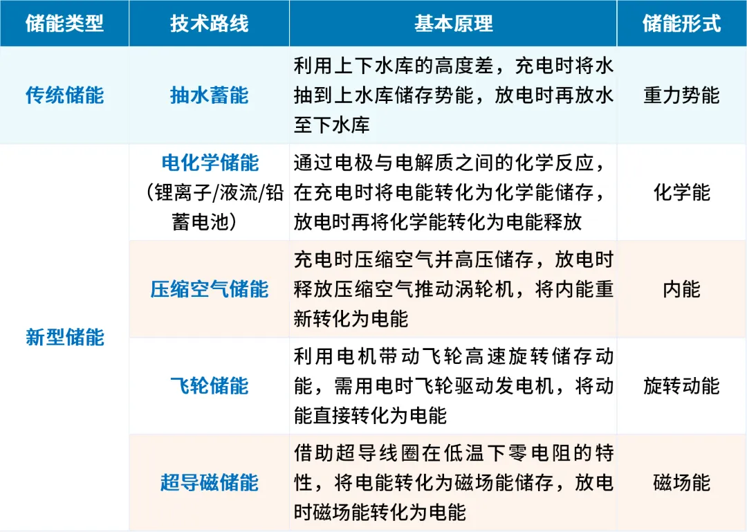 而新型储能的技术较为多元,既包括将电能转化为化学能来存储和释放的电化学储能(如锂离子电池),还包括空气储能(内能)、热储能(热能)等等,如下面的表格所示。