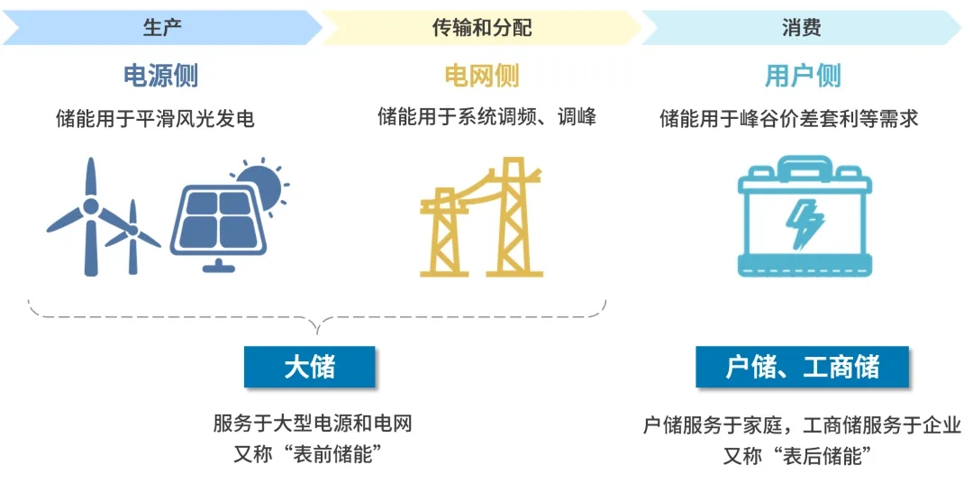 而大储(大型储能)指的就是服务于电网侧或电源侧的储能。这类储能的应用场景对规模等级要求较高,所以被称为大储。由于它一般安装在电网电表之前,所以也被称为“表前储能”。