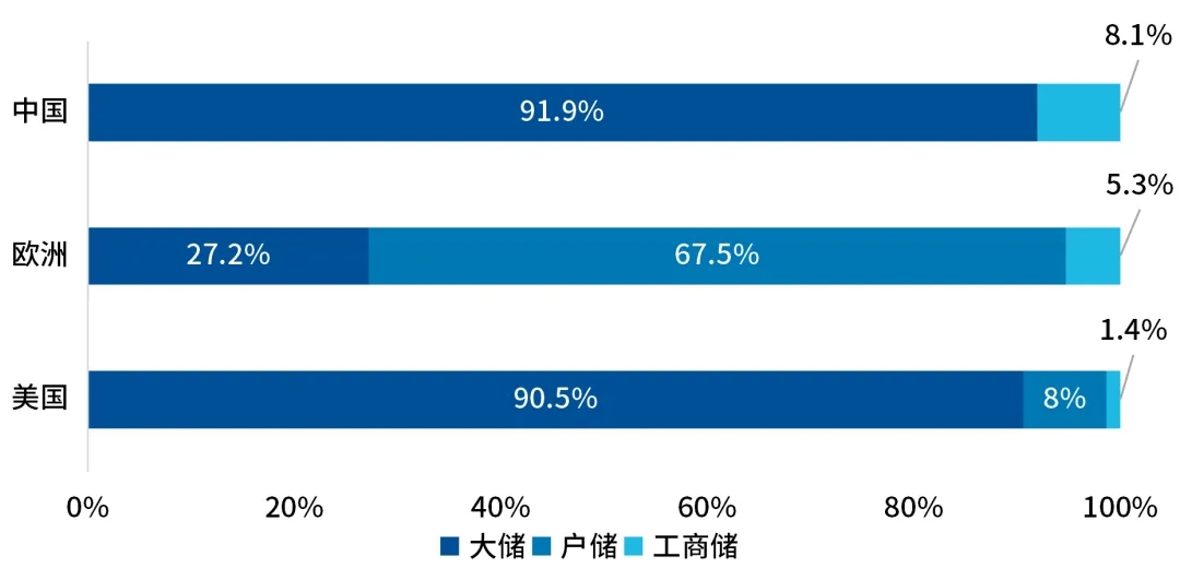 当前户储的主要市场集中于欧洲,而我国的户储市场规模较小。这主要是因为,我国居民电价低,政策管控下的峰谷电价差小,安装户储的动力相对不足;而欧洲等地电价偏贵、电力市场化程度高,电价跟随电力情况波动,峰谷价差很大,更能够通过户储降低用电成本,且住宅条件也更适合安装。如下图所示,欧洲户储装机量在各类储能中的占比接近一半。