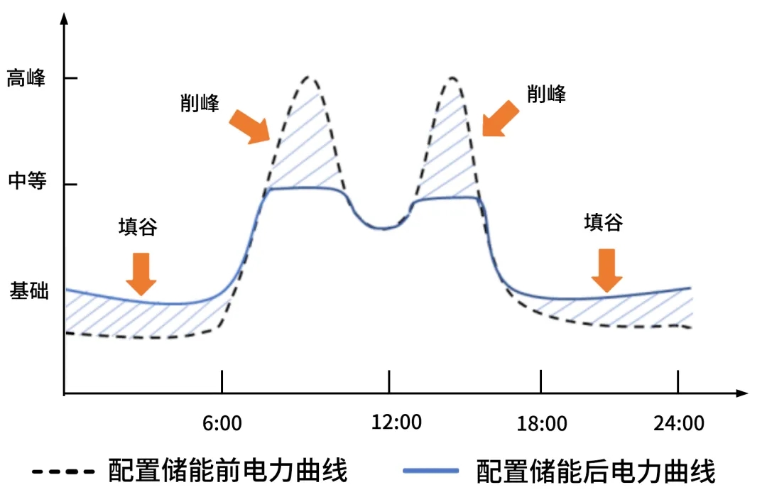 在工商业用户端,电网存在峰谷电价差,储能系统通过在电价低的谷段从电网充电,在电价高的峰段释放储存的电能供用户使用,实现削峰填谷,降低用电成本,如下图所示: