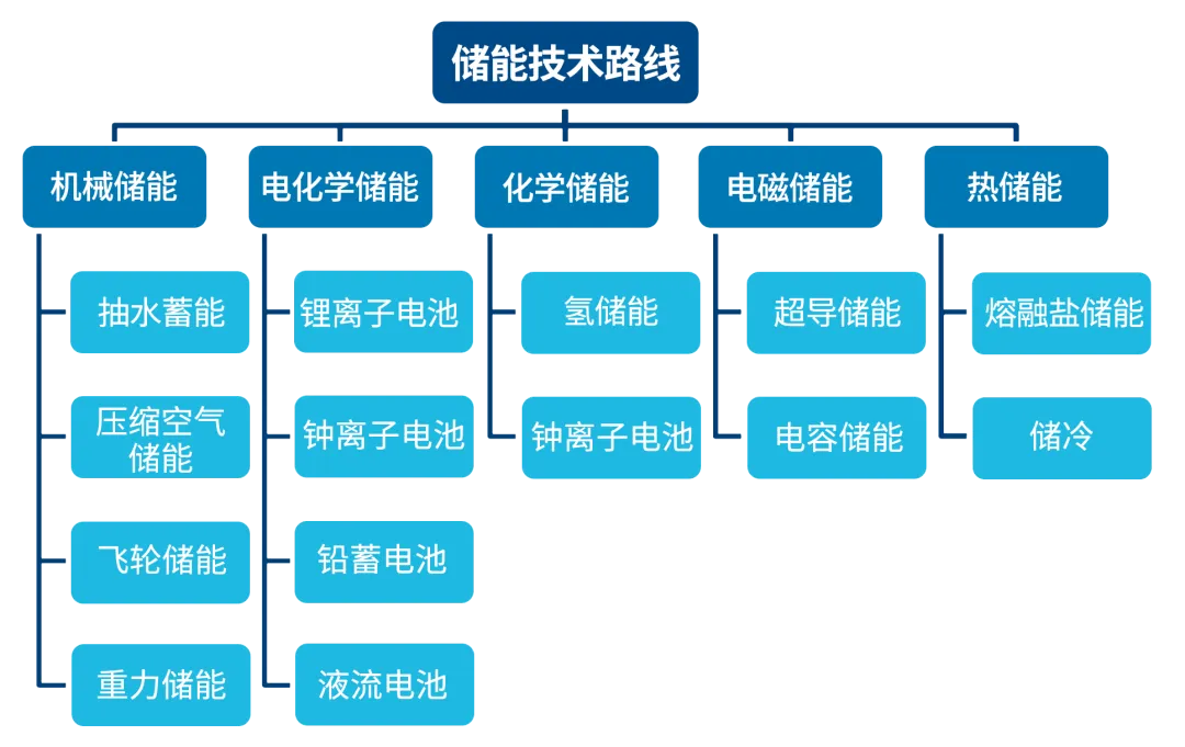 储能的技术路线众多,根据能量存储形式的不同,可以分为机械储能、电化学储能、化学储能、电磁储能和热储能等。