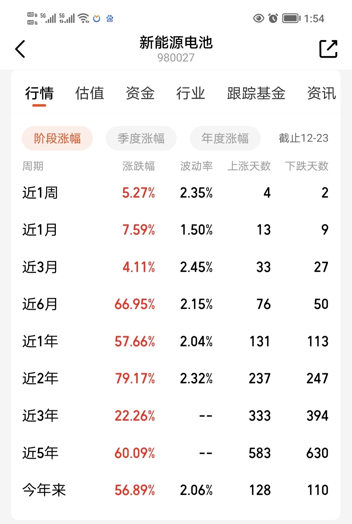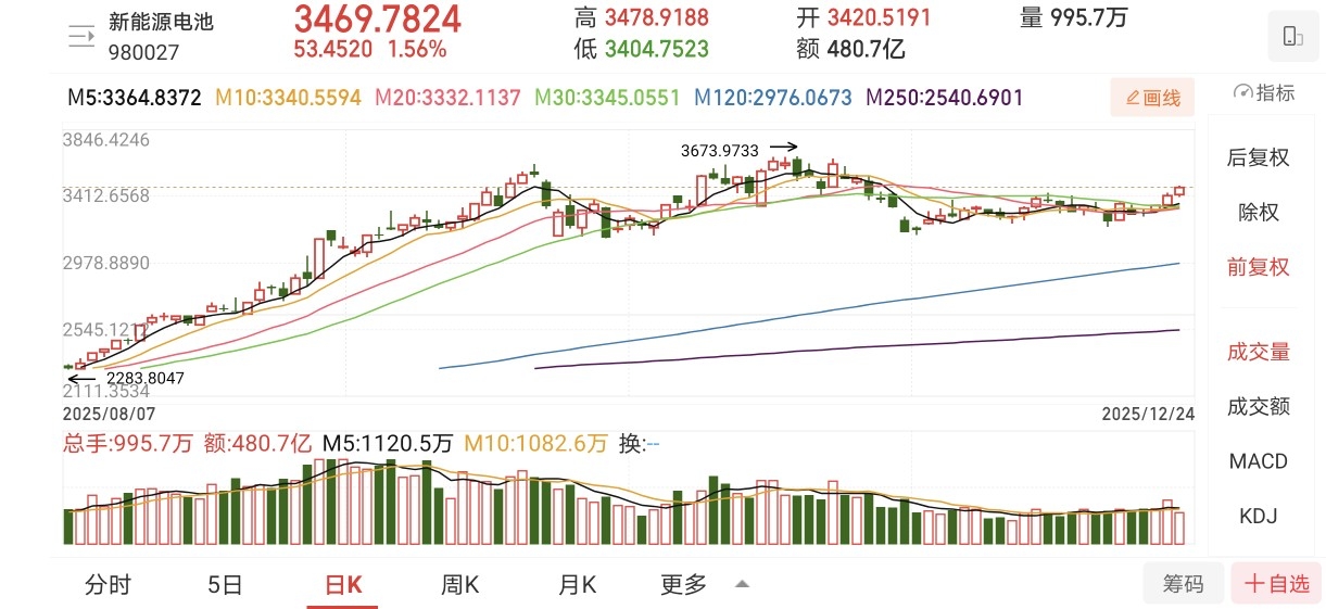 12月24日A股三大指数继续上攻,截止我发文时,上证指数涨0.68%,深证成指涨0.95%,创业板指涨0.89%。电源设备、电池等涨幅靠前。国证新能源电池指数(980027)目前涨1.73%,又走出一根实体阳线,突破了12月9日的平台小高点,打开了新的上升空间。技术形态上成功实现三连阳,形成了红三兵积极形态,转强信号明显。