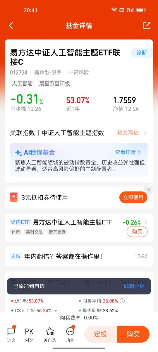 年初我就觉得,人工智能肯定不是喊喊口号了,那些大模型不再只是实验室里的技术,而是真的要走进工厂、医院、互联网公司这些地方,从技术变成实实在在的生意。所以最先关注的就是$易方达中证人工智能主题ETF联接C$ ,这只基金跟踪的指数,把人工智能从芯片、服务器这些“硬设备”,到聊天机器人、智能办公这些“软应用”的优质公司都涵盖了,比单买某一只人工智能股票靠谱多了。上半年这板块跌的时候,我就盯着它的持仓和净值变化,发现它能稳稳跟上板块的整体节奏,果然到了三季度,不少AI公司赚了真金白银,这只基金的净值也跟着往上走,完全印证了我对AI商业化落地的判断。