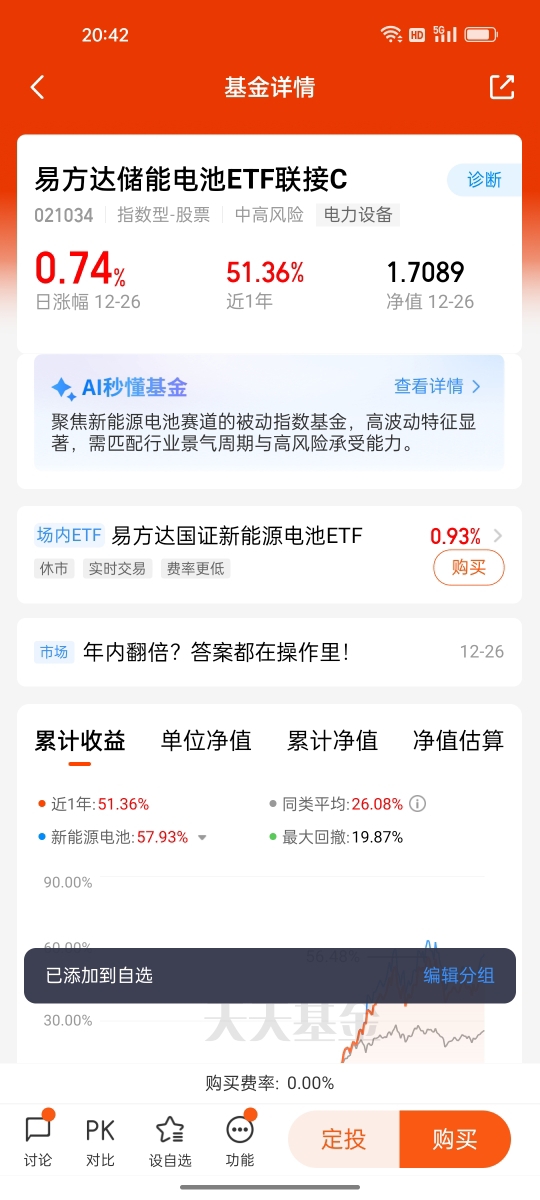 至于储能电池,我是把它当成新能源赛道的“潜力股”来看的。前几年光伏、风电装得越来越多,但电能不能存下来就很浪费,储能电池刚好解决了这个问题,需求肯定会越来越大。$易方达储能电池ETF联接C$ 专门盯着储能电池的上下游,从做电池材料的公司,到组装储能系统的企业都包含在内,能完整捕捉这个赛道的红利。年中新能源板块整体调整的时候,我就分析这只基金的持仓结构,发现它选的都是储能领域的龙头,后续储能相关政策一出台,这只基金的表现果然很亮眼。