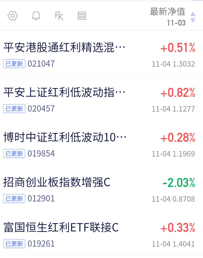 来了,来了,更新了,今天权益市场看起来比较一般,三大指数低开低走,红利板块还是有韧性支撑,逆市收涨!平安港股通红利精选混合C,+0.51%,不错,厉害了