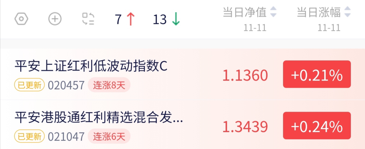 $平安港股通红利精选混合发起式C$ 今天涨了0.24%,以,连今天上涨7天了。