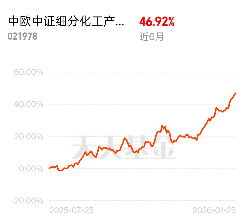 化工板块的机会真的藏不住了,工信部等七部门出的稳增长方案给行业定了年均 5% 以上增长目标,有机硅反内卷让供需变好,2026 年缺口还会扩,中欧中证细分化工产业主题指数发起 C 近 6 月 46.92%,政策加持周期反转拐点已至