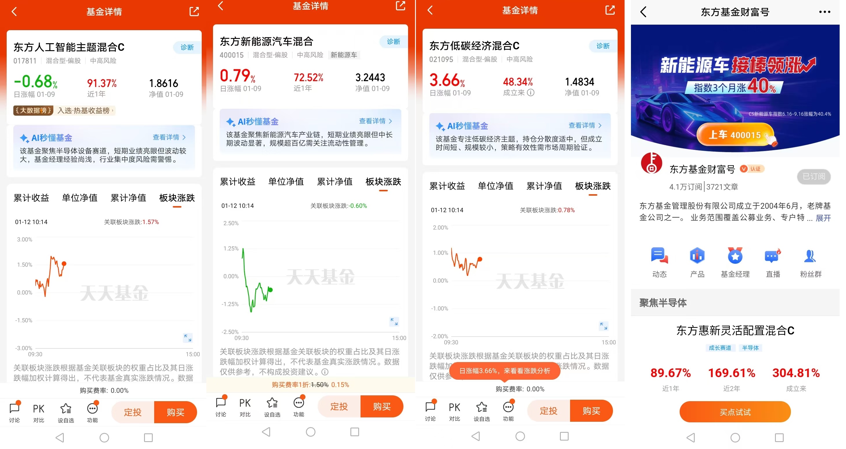 我知道,投资有风险,市场有波动,没有任何一只基金能够保证永远盈利。但通过大半年的研究和了解,我坚信东方基金的专业能力,也看好这三只基金所聚焦的新能源汽车、人工智能和低碳经济三大赛道的长期发展前景。这三只基金各有侧重,能够形成互补,构建一个相对稳健的投资组合:东方新能源汽车混合基金业绩爆发力强,能够分享汽车产业变革的红利;东方人工智能主题混合C基金成长潜力大,能够把握科技发展的趋势;东方低碳经济混合C基金稳健性好,能够为投资组合提供稳定的支撑。