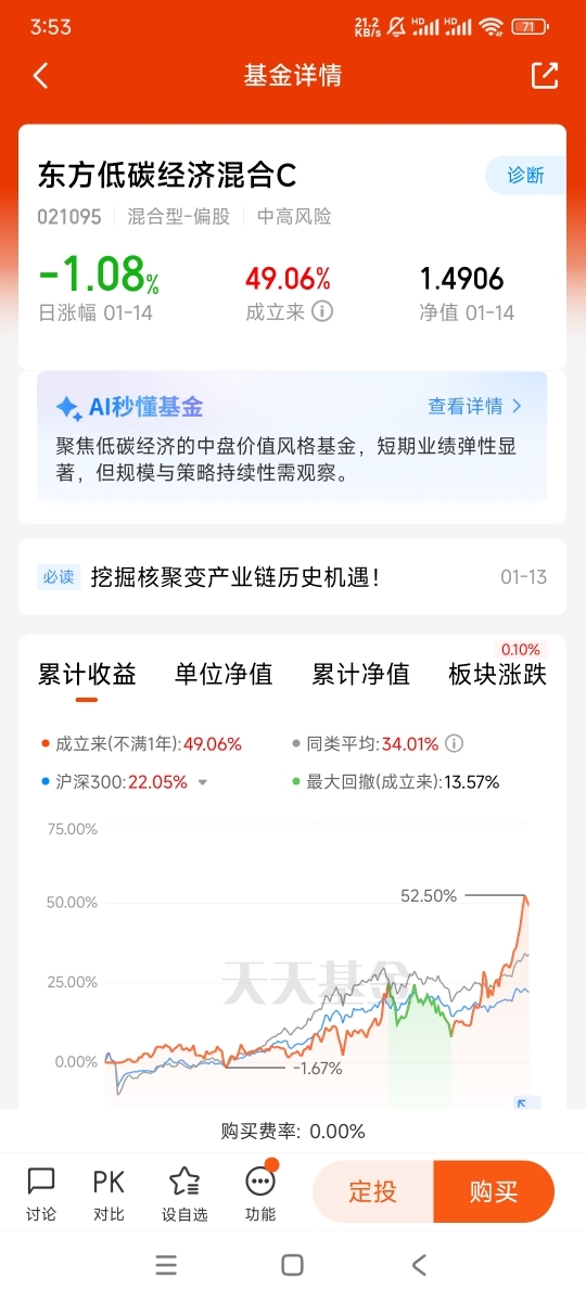 其三,业绩表现亮眼,风险控制能力突出。基金自2025年3月成立以来,整体收益已达21.76%,近一个月收益更是高达11.95%,在10月9日单日净值暴涨6.46%,充分体现了其把握低碳经济赛道机遇的能力。在风险控制方面,基金通过分散投资降低单一行业与个股风险,投资范围覆盖股票、债券、货币市场工具等多种资产,形成了多元化的风险对冲体系 。同时,基金对个股的深入研究与严格筛选,能够有效规避技术转化不及预期、业绩兑现缓慢等行业潜在风险,在追求收益的同时保障了基金资产的稳健性。这种“高收益+低波动”的业绩特征,使其在核聚变这类高成长、高潜力赛道中,既能享受板块增长红利,又能有效控制投资风险,适合长期配置。