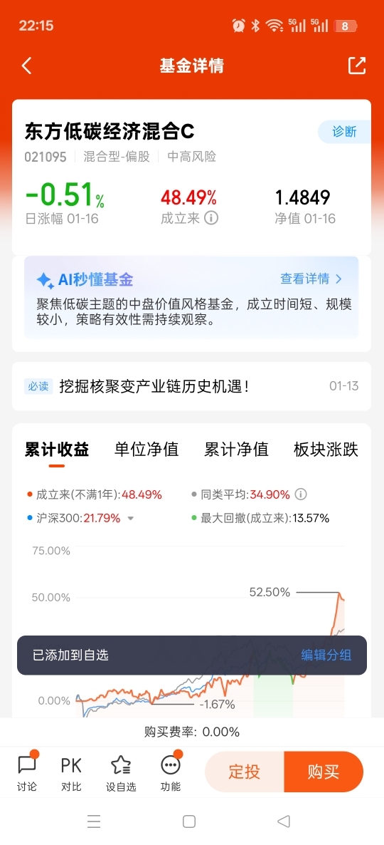 我已经把$东方低碳经济混合C$ 加入自选,计划每月从结余里拿出800元,一半定投这只基金,一半配稳健债基,做到股债搭配、攻守兼备。平时尽量少盯盘,不追热点、不跟风,只在每月末做一次简单复盘,不让短期波动影响心情。
