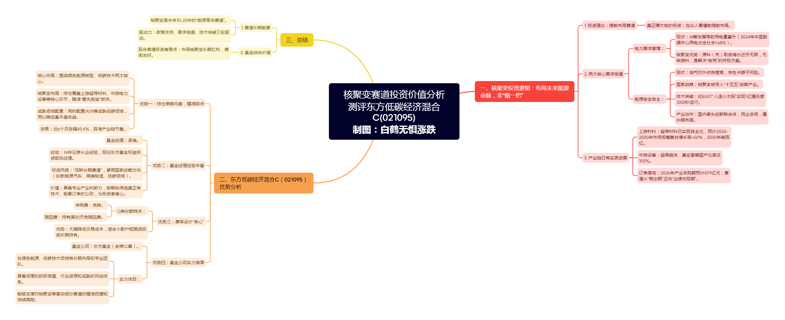 接下来白鹤君就跟大家一起聊聊自己对于核聚变赛道的看法,并深度测评下东方低碳经济混合C(021095)基金,文章有点长,这里也是做了个思维导图,方便大家整理思路,可以点开放大了看下的。