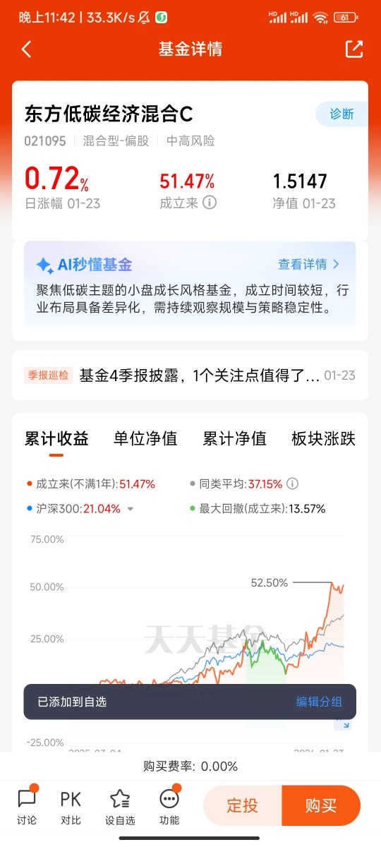 三是收益预期:不追求短期爆发性收益,参考基金成立以来14.37%的累计收益和低碳行业的增长潜力,给2026年设定10%-15%的合理收益目标,既能跑赢通胀和货币基金,又不会因过高预期陷入焦虑,毕竟“躺平”的核心就是心态放松。