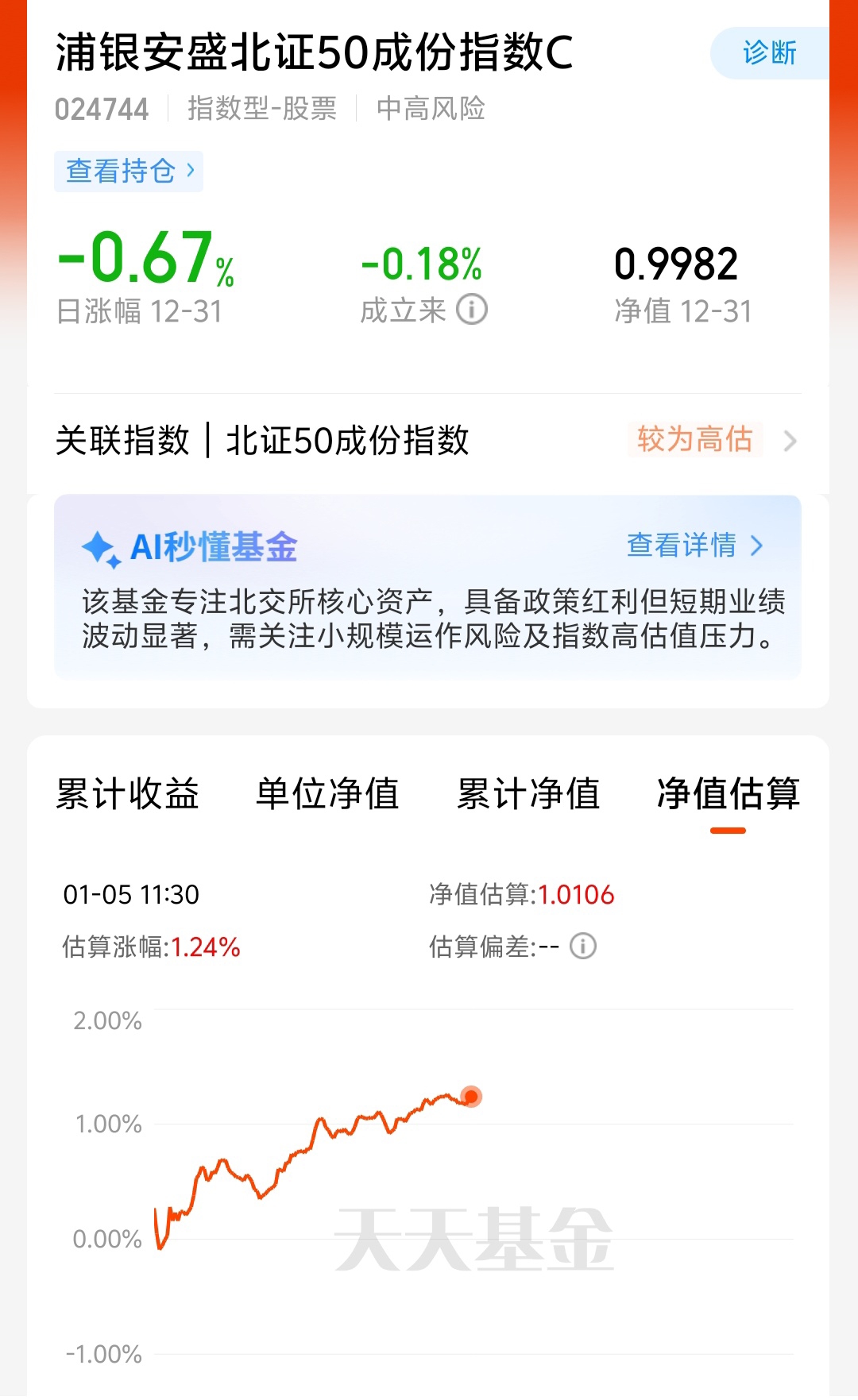 $浦银安盛北证50成份指数C$ 被动指数基金买哪家都一样,唯一区别就是费率和额度,这个C份额销服只有0.25%,一年下来也能再省不少钱,而且产品不限额。$浦银安盛北证50成份指数A$