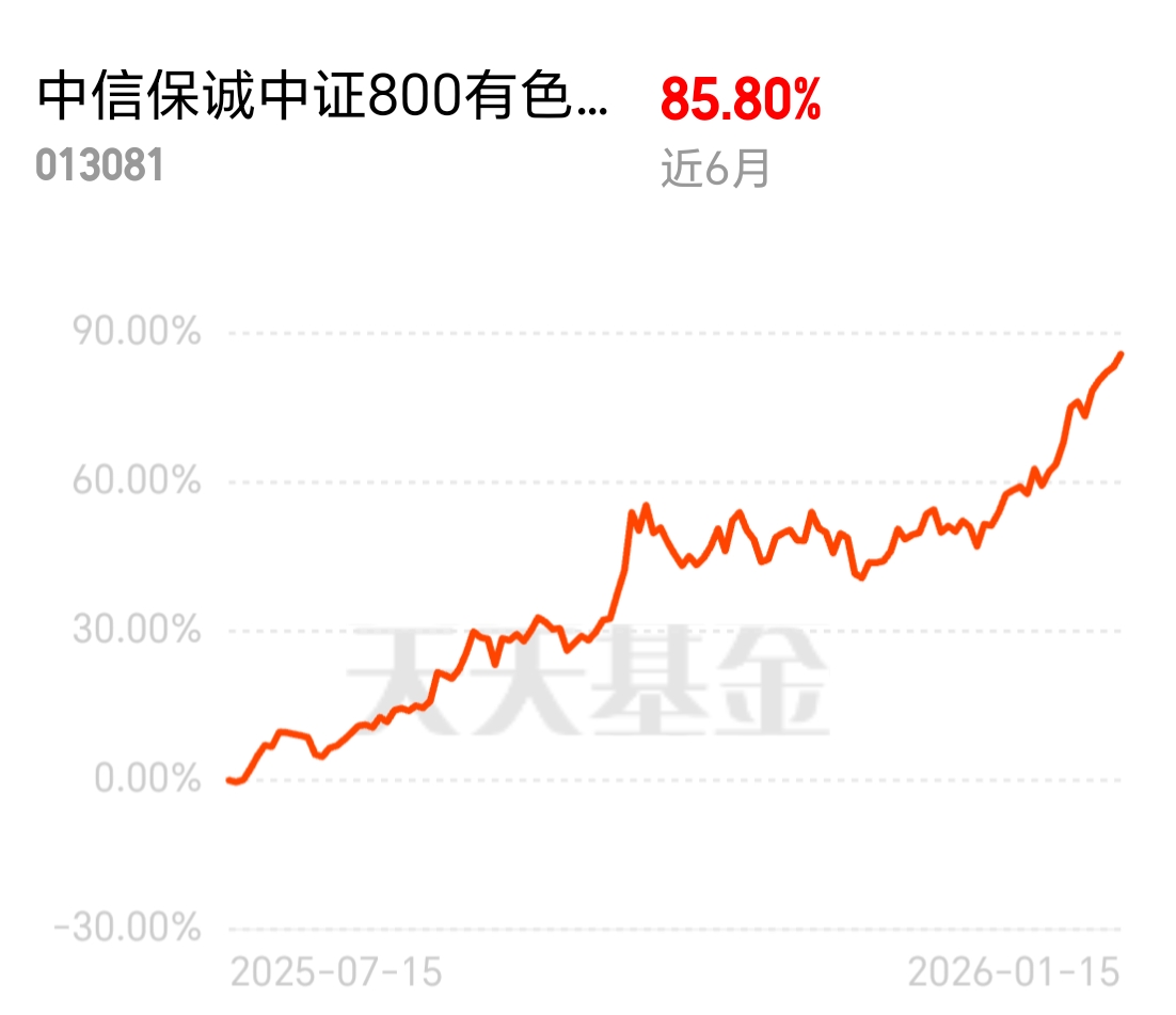 有色板块五连阳强势上行,开盘领涨各大板块。中信保诚中证 800 有色指数 (LOF) C 布局稀有金属这类核心资源,近 6 月涨了 85.80%,赚钱效应十足,讨论区福利红包还在,快去领福利沾喜气。$中信保诚中证800有色指数(LOF)C$