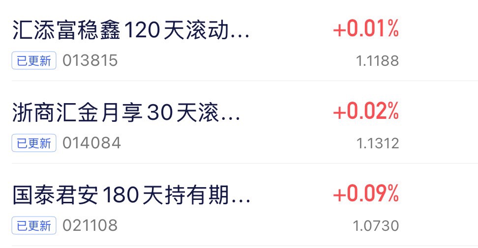 说实话,今天债市收盘真让我有点意外,下跌有点快,还好手上有国泰家的基,才不慌。$汇添富稳鑫120天滚动持有债券C$ 收了1个蛋$浙商汇金月享30天滚动持有中短债C$ 收了2个蛋$国泰君安180天持有债券发起A$ 收了9个蛋