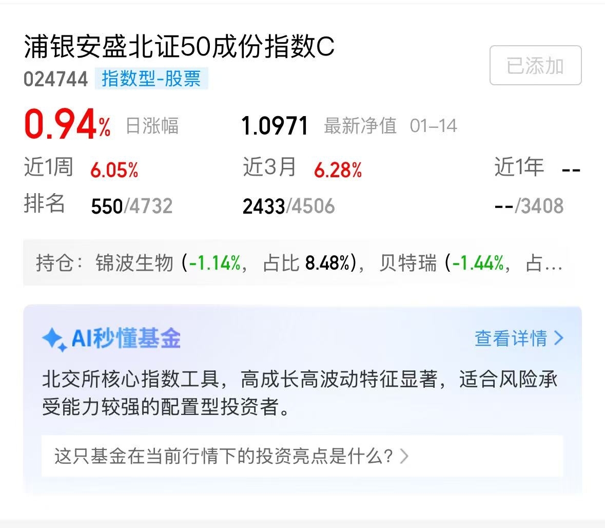 浦银安盛北证50太靠谱,今天0.94%超额指数!北证上涨趋势稳,这只不限购+省费用,想赚就别等$浦银安盛北证50成份指数C$
