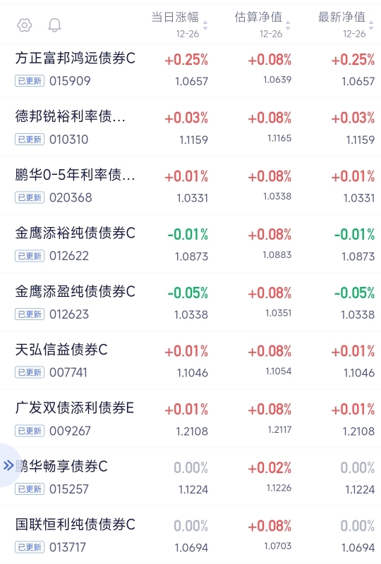 今天债市情绪偏暖,利率债小幅上涨,超长端收益略好些。$方正富邦鸿远债券C$ 又收了25个蛋,继续修复之前的小回撤,其他债基也有零星进账。资金面宽松,隔夜便宜,感觉市场在为跨年做准备。不求大涨,稳稳收点小蛋就很满足啦!$上银政策性金融债债券C$