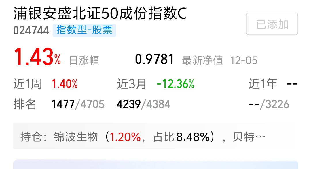 这个产品$浦银安盛北证50成份指数C$ $浦银安盛北证50成份指数A$ 刚成立没多久,额度充足,方便后面补仓。年末或有北证专精特新指数基金入场带来资金增量,也将催化北证50迎来上涨行情。