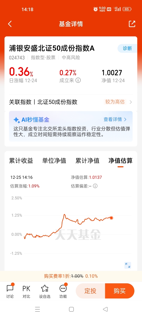 北证50最近稳步修复,小盘股表现的很明显,$浦银安盛北证50成份指数A$费率低,