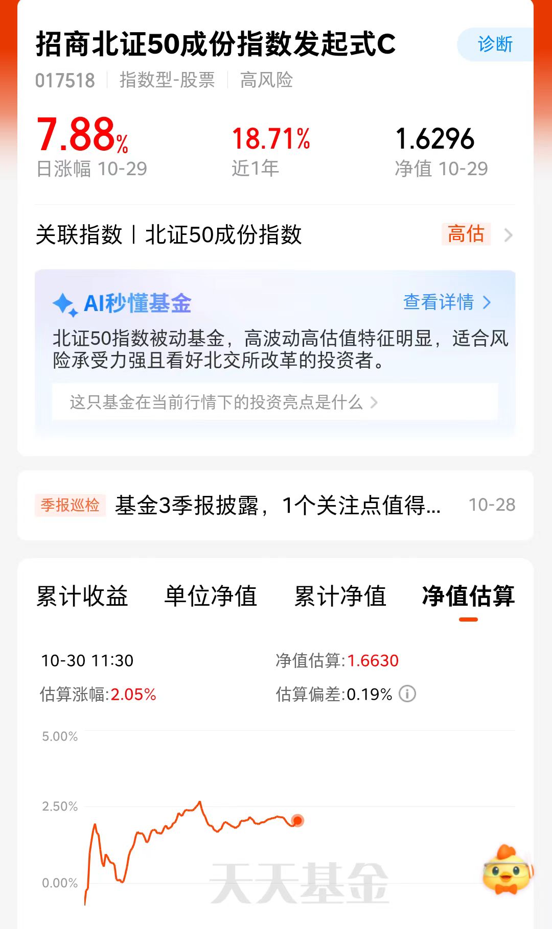 昨天沪指冲新高,科技板块强势,但是科技板块细分太多,还是会出现分化,北证50强势上涨,$招商北证50成份指数发起式C(OTCFUND|017518)$,昨天强势上涨7.88%,今天盘中估值上涨超2个点,北交所流动性强,之前又横盘了一点时间,现在涨势回归,可以考虑上车了。