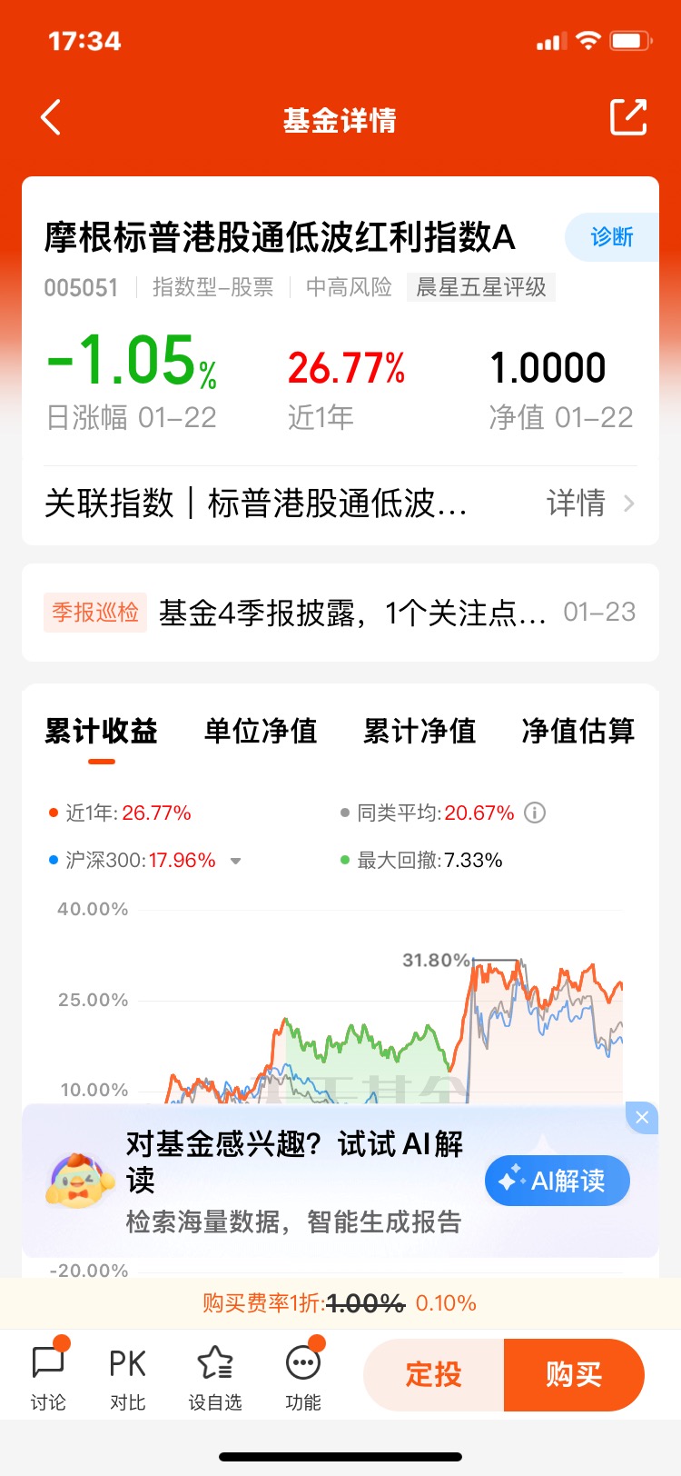 $摩根标普港股通低波红利指数A$$摩根标普港股通低波红利指数C$都是不错的选择。