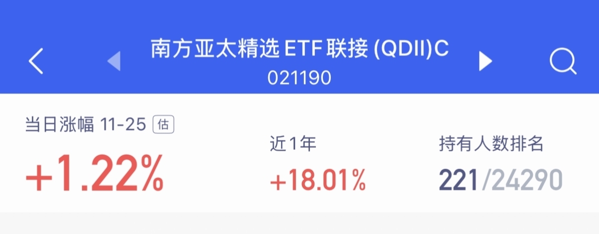 亚太精选今天估值上涨1.22%,因为11月24日休市,所以净值合并更新$南方亚太精选ETF联接(QDII)C$