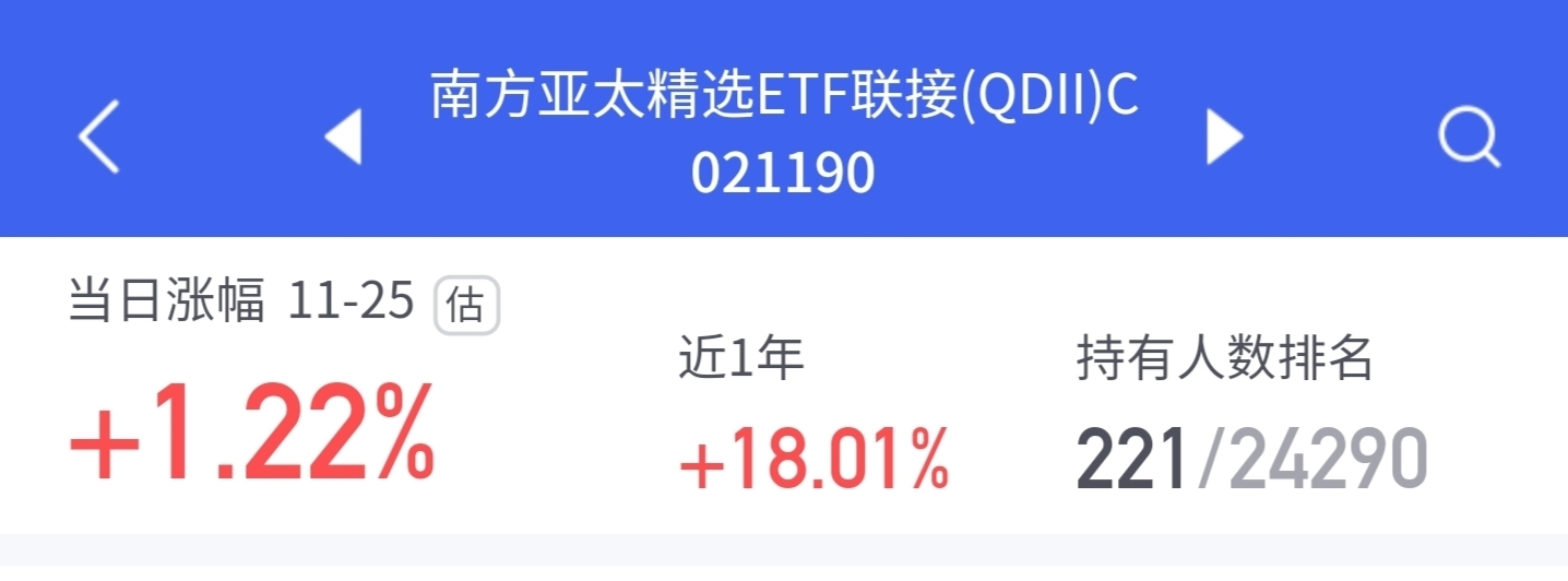 $南方亚太精选ETF联接(QDII)C$今天估值又涨了1.22%,真不错,上周其