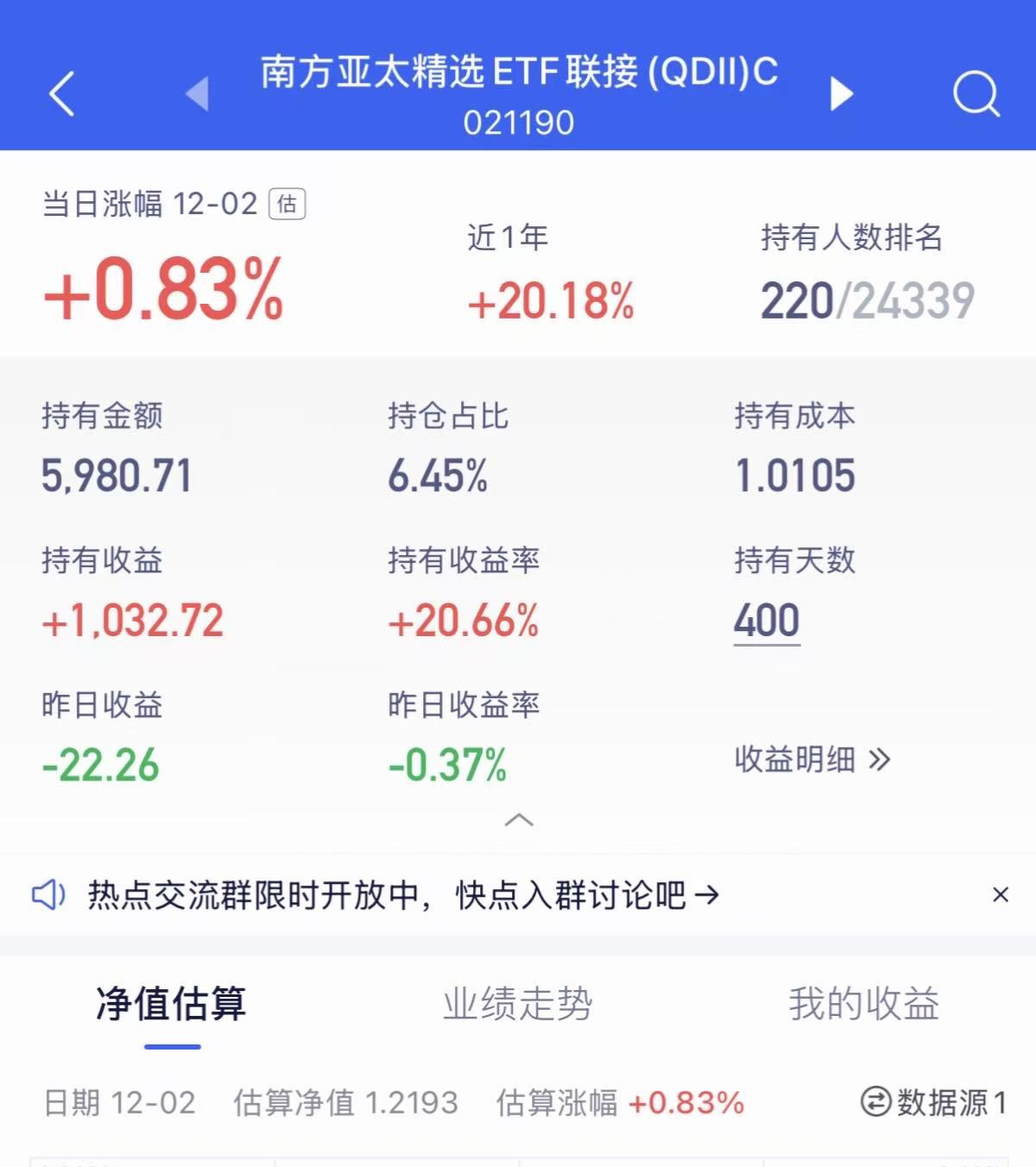 莫慌莫慌,我来给大家报估值吧,今天预估上涨0.83%。亚太精选涨跌幅度都比较小,做为底仓其实比较稳