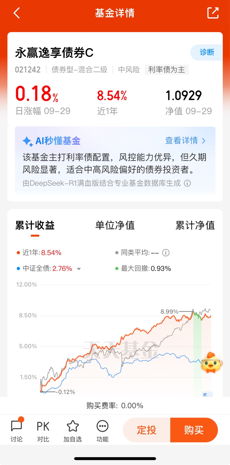 $永赢逸享债券C$ 今天收18个蛋,近3个月收54个蛋,近6个月收311个蛋,近一年收854个蛋,表现还好哈!定位低波固收+,通过利率债、信用债构筑安全垫,辅以少量可转债与股票捕捉机遇。权益部分聚焦大盘龙头及多元赛道,在分散风险的同时保留一定向上弹性。债券端侧重高评级品种,严控信用风险。经理沿用成熟策略,擅长通过股债动态对冲与波段操作平滑波动。