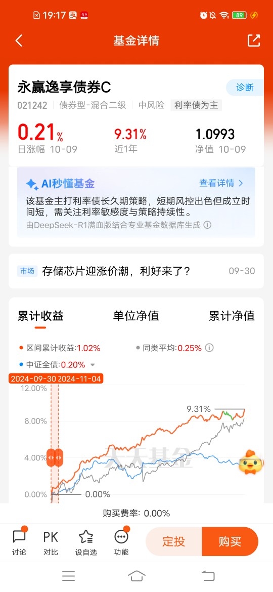 $永赢逸享债券C$ 节后开门红,收蛋能力不错,低波动固收+涨多跌少,今晚更新收21个蛋,近一个月收87个蛋,近半年收305个蛋,近一年收931个蛋,中长期更有优势,只配置权益风险大,当下均衡配置更适宜。多种债券组合,更有弹性!不想大起大落的,稳妥点也不错!#国际金价史上首次升破4000美元大关#