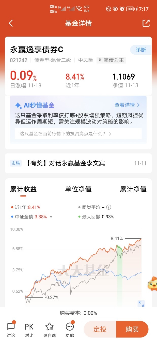 在市场不确定性增加时,固收+产品凭借股债混合优势,既能缓冲下跌风险,又能分享上涨收益。$永赢逸享债券C$ 正是此类策略的典范,今天收下9颗蛋,最近一年涨幅8.41%,其资产配置以低风险利率债为核心,辅以可转债和股票增强收益。它保持了每个月都取得正收益的记录,这种持续的稳定性在当前尤为可贵。波动相对较小,完全符合投资者对于防守型混合债基的期待,其综合性价比在当前环境下往往优于纯粹的利率债或信用债基金#多重利好催化!新能源走强#