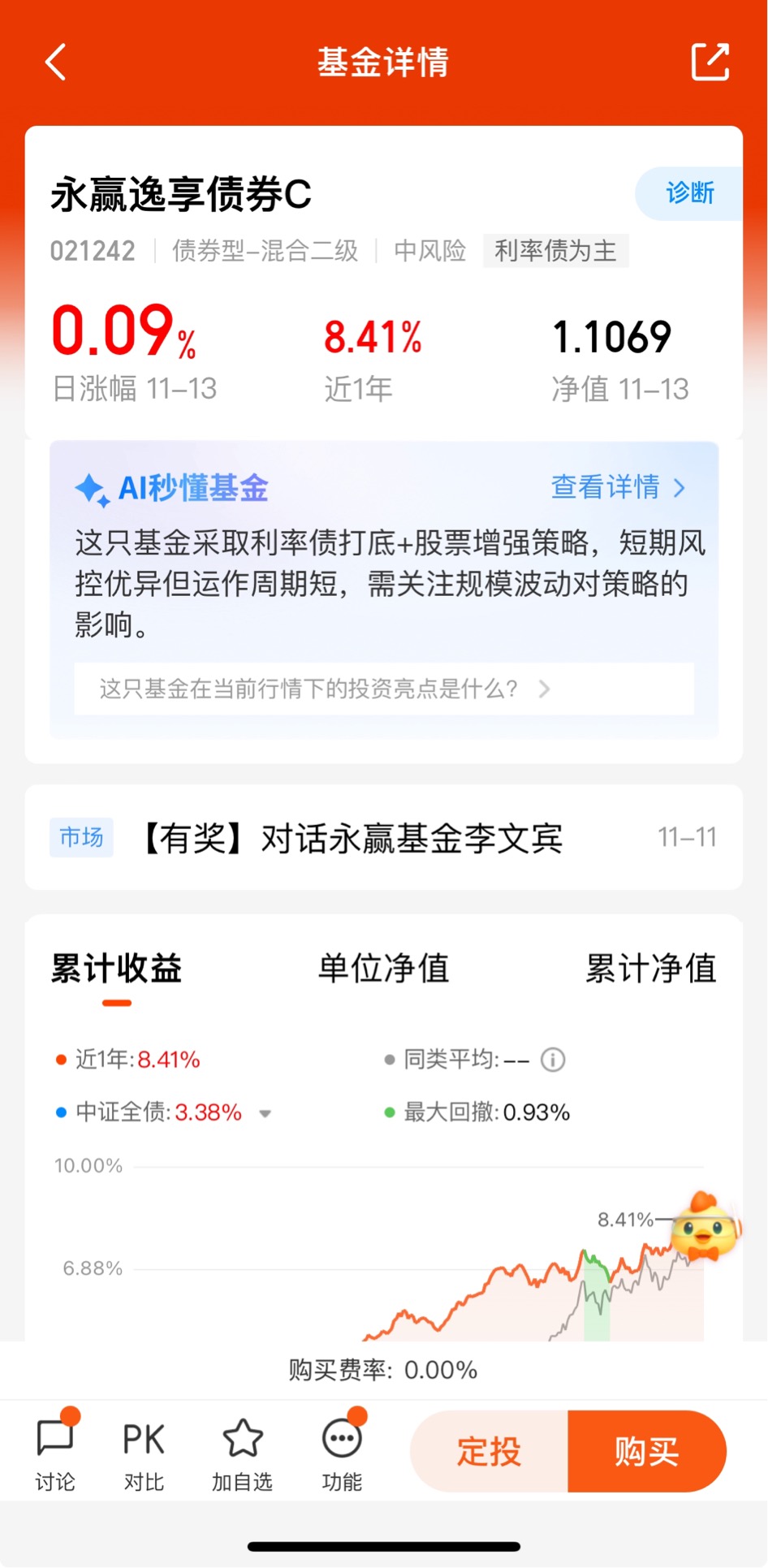 $永赢逸享债券C$ 今天收9个蛋,近一个月收80个蛋,近3个月收137个蛋,近6个月收276个蛋,近一年收841个蛋,还有发展空间!它主要聚焦利率债的混合二级债基,用的杠杆策略,这样的组合效应凸显,低波固收+债基稳中有升,持有体验稳健获益不错。