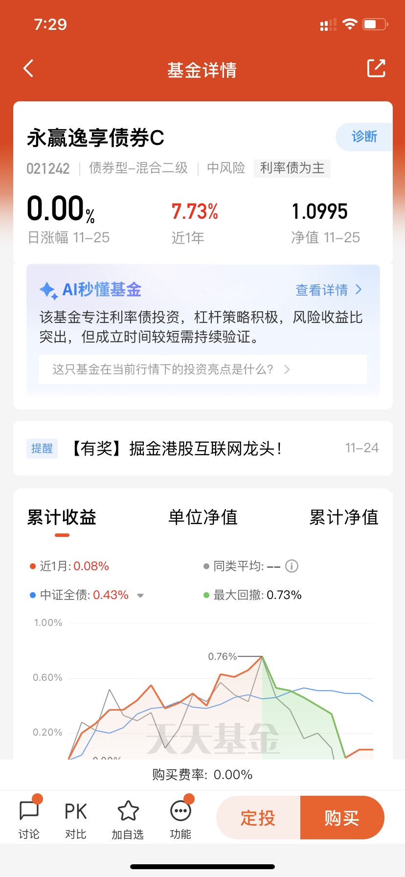 $永赢逸享债券C$ 专注利率债投资,还有少量信用债一起固收打底,加上可转债和股票增厚收益,这样的配置策略可以说还是很抗波动的咯!这里近半年230个蛋,近一年773个蛋,业绩还算不错,从这里的净值表现来看,这里回撤控制的也不错,值得继续关注,期待接下来的表现咯!#今年买基金赚了多少钱?#