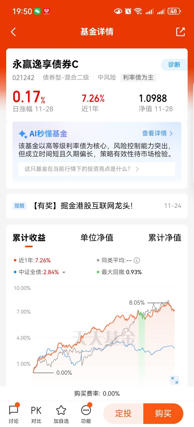 $永赢逸享债券C$ 今天收17个蛋,它采用股债对冲策略,比如通过利率债调整久期对冲权益风险,让收益与回撤之间找到精妙平衡,业绩方面表现得还不错,近六个月收243个蛋,近一年收726个蛋,整体还不错,稳中有进。#3800点的A股值得加仓吗?#