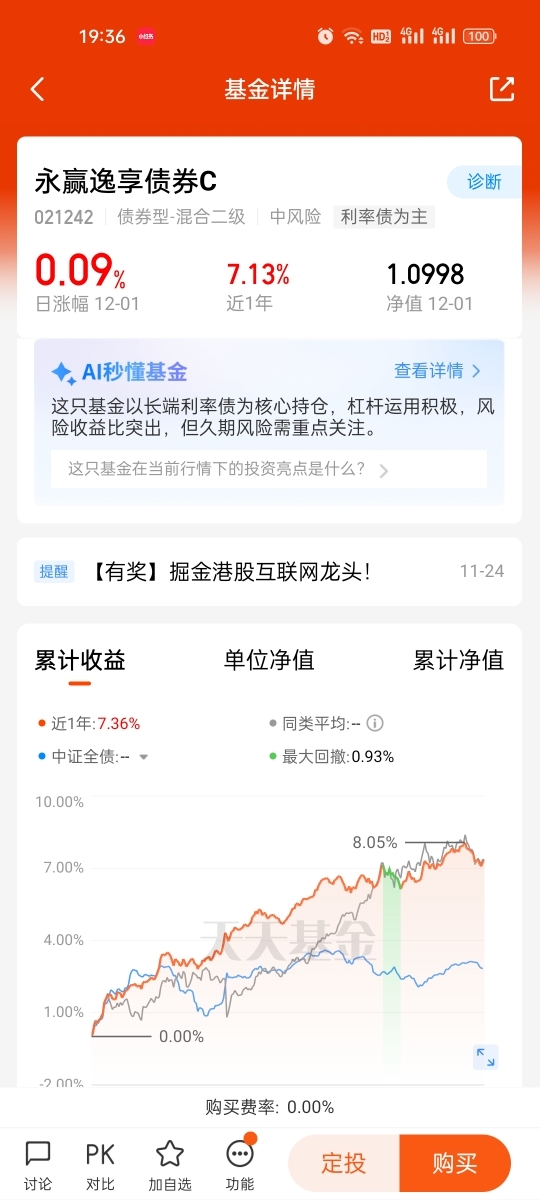 12月第一天今天红色星期一,永赢逸享债券C021242表现不错,今天净值又收9个恐龙蛋,近六个月收243个蛋,近一年收713个蛋,同类排名优秀。债券基金根本不用担心亏钱,也不用择时,什么时候上车都不晚。