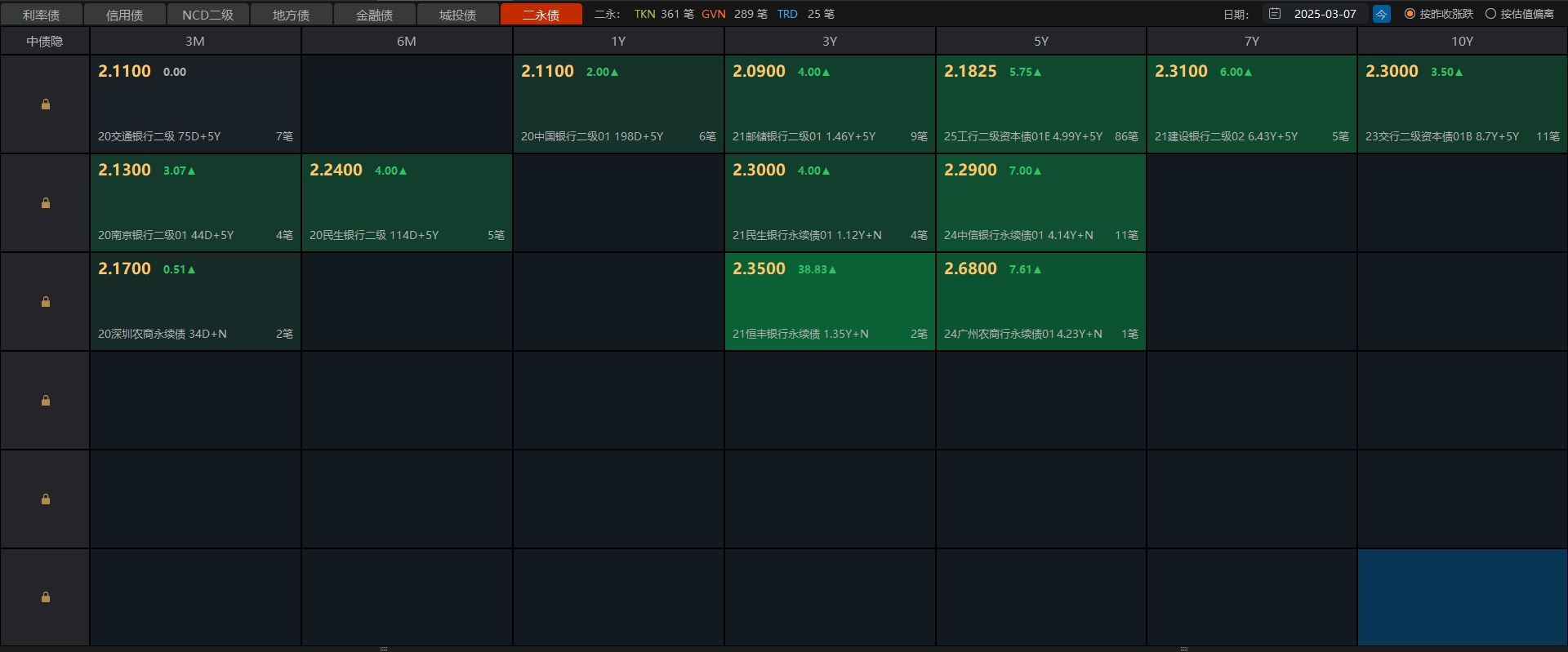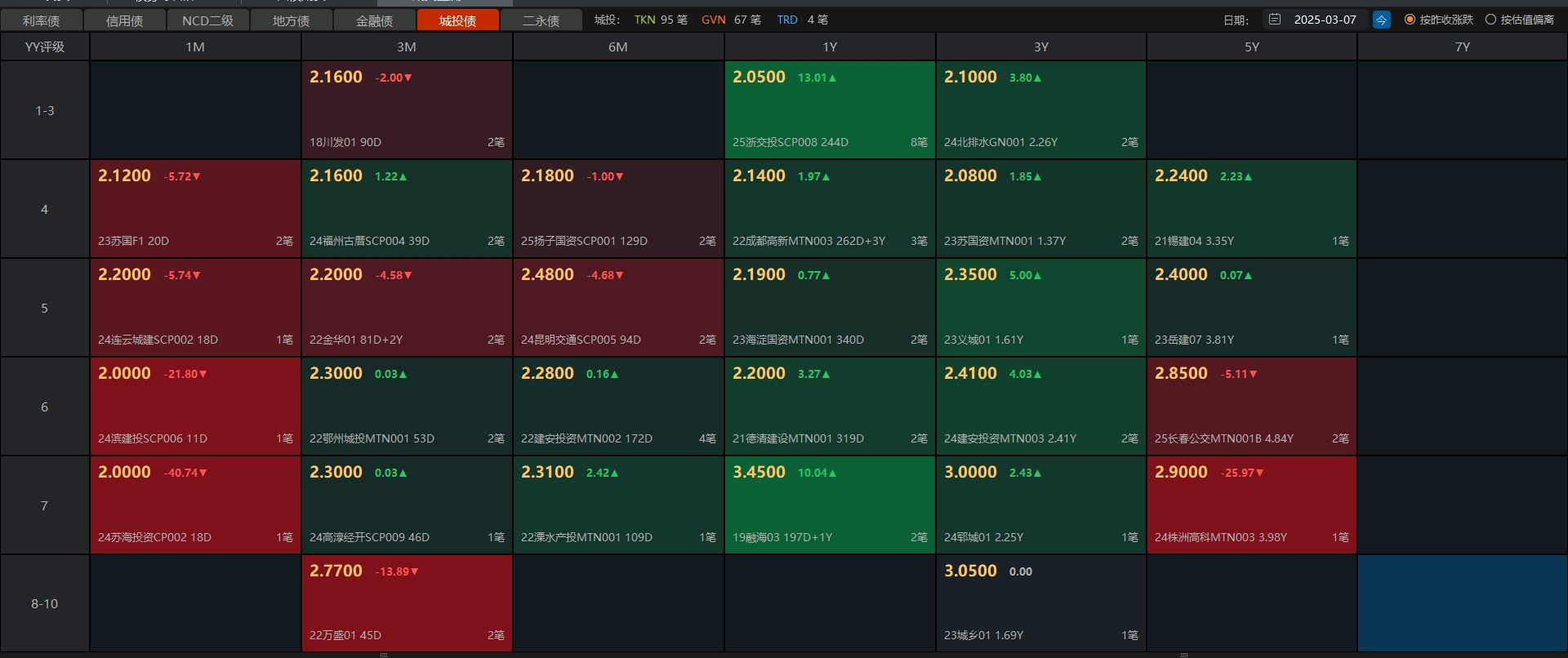 03月07日债市午间天气播报:利率债盘面就短端和地方债个别上涨,其他跌的幅度跟昨天差不多,中长端二三十个碎蛋,超长期更多。信用债也好不到哪儿去,就短端和低等级的一小部分城投债上涨,其余大多都下跌,长端银行跌幅比昨天还大。