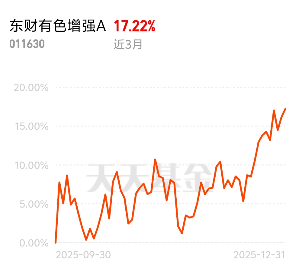 美联储降息后美元走弱,贵金属、工业金属集体涨价,东财有色增强 A 近 3 月涨了 17.22%。2026 坚定看好有色金属,继续定投,稳稳接住行业红利就好。
