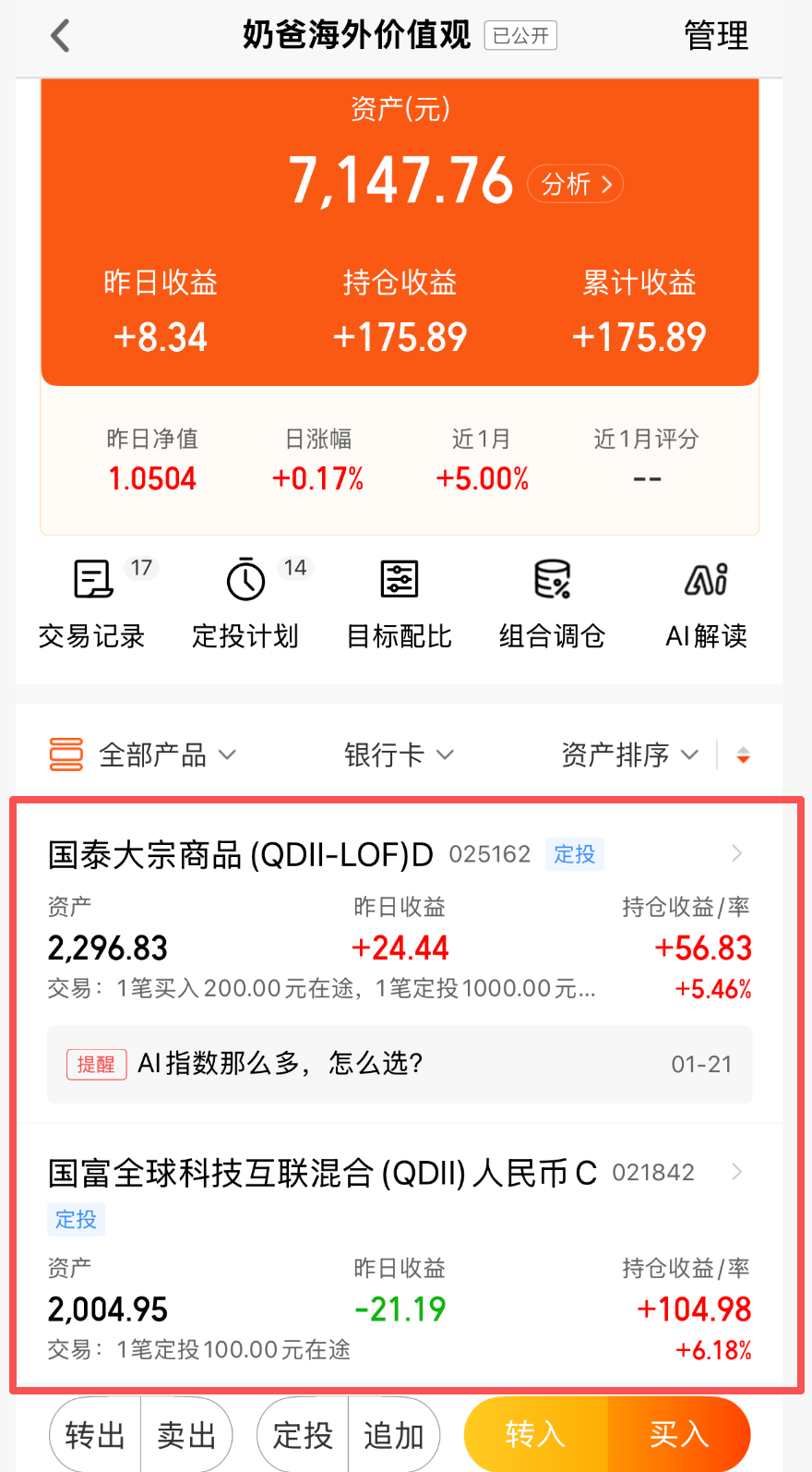 海外大宗和科技:放一起截图给大家,目前都在定投,具体可以看看海外价值观组合