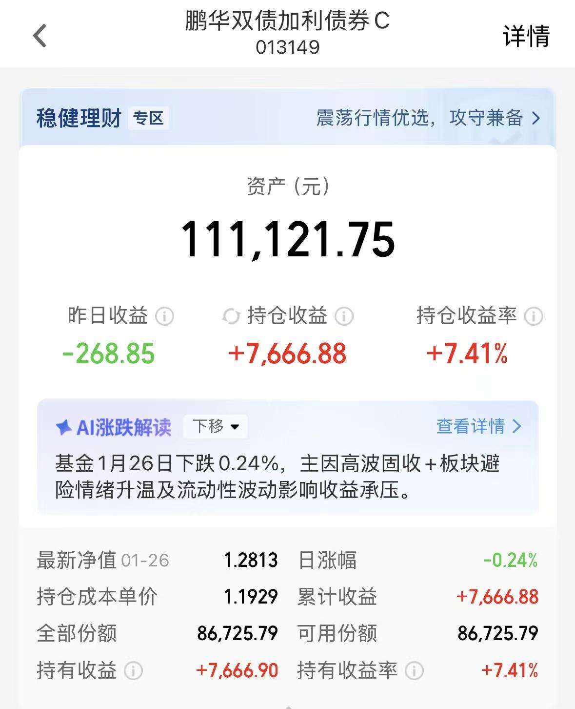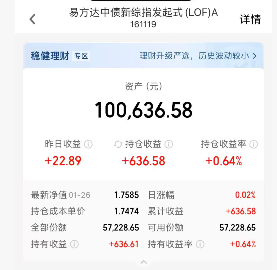 我债,虽慢,但到。之前我提过债市越来越回归“还本付息”的特点。为了合理的资产管理,我还有不到20w纯债债基持仓,其中10w在久期3年左右的易方达中债指数。26年1月到到昨天16个交易日,除了开年被股市暴击吃面外,已经连续收蛋13天。