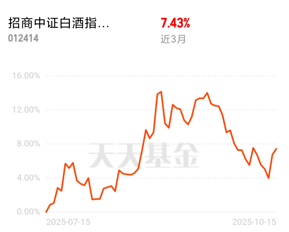 今天白酒行情给力!招商中证白酒C估值涨一个多点,近三月大涨7.43%,靠谱。现在