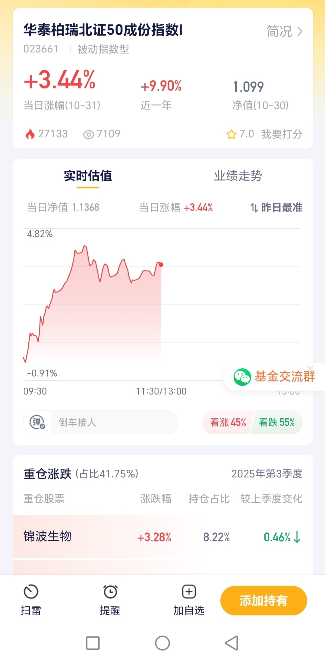兄弟们,今天北证50表现亮眼,华泰柏瑞当日涨3.44%,近一年也有9.90%的收