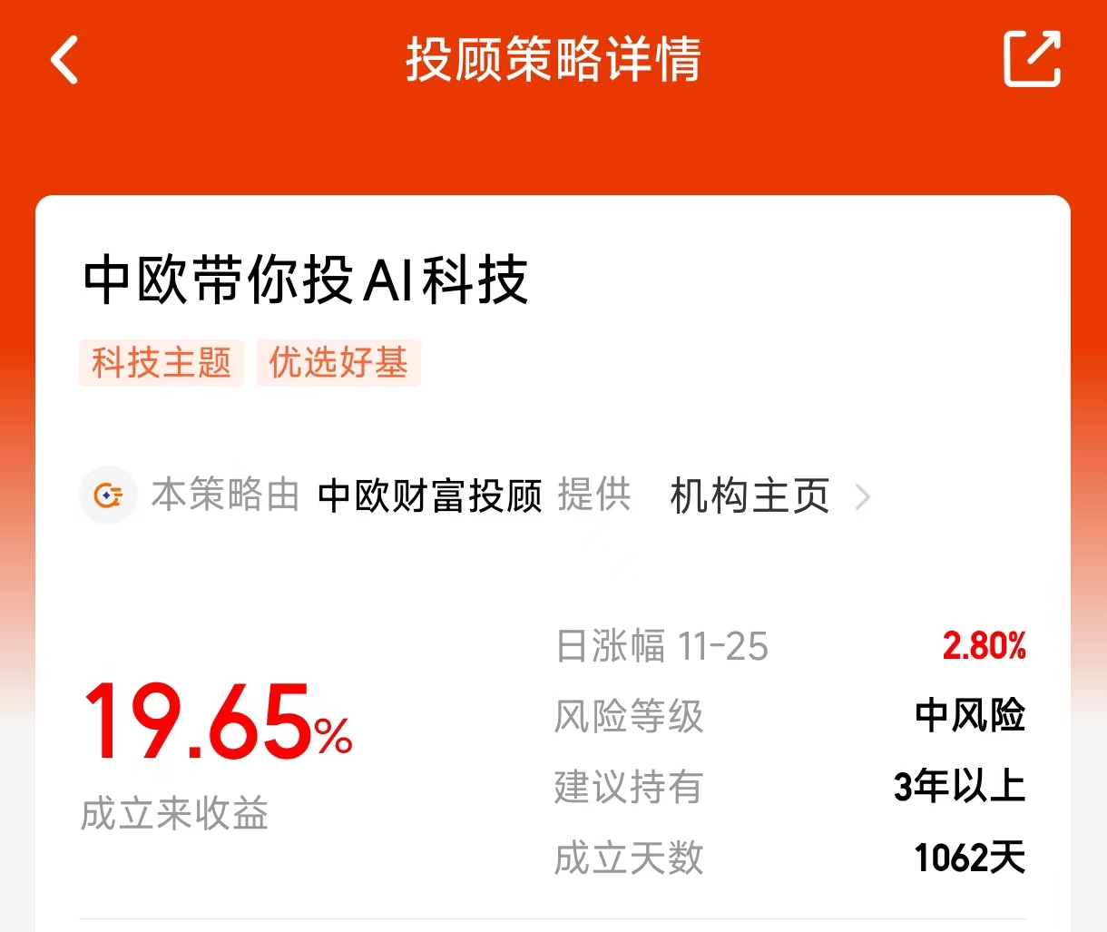 近期市场讨论最多的莫过于“科技是否高估”,其实答案取决于细分领域。例如算力基础设施受益于全球云厂商资本开支增长,而部分应用端公司仍处探索期。中欧带你投AI科技组合的优势在于,它能通过专业研究覆盖产业链上下游,避免个人视角的局限。组合近一年43.36%的收益,来源于对数字经济增长、半导体复苏等多方向的均衡捕捉,且夏普比率表明其波动控制有效。对于想长期布局科技但缺乏行业知识的投资者,这种“全赛道覆盖+主动调仓”的投顾服务,可能比盲目选择单只基金更稳妥。#3800点的A股值得加仓吗?#