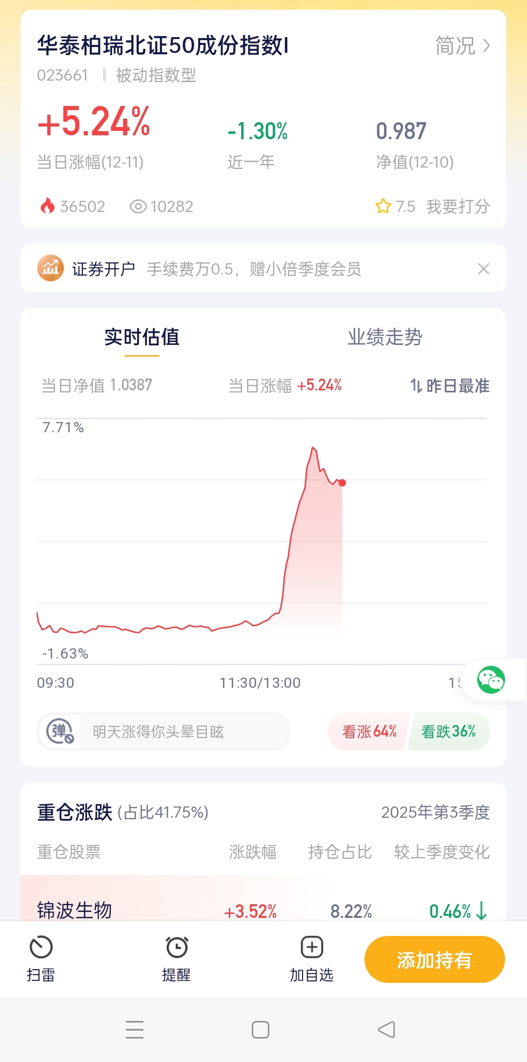今儿盯北证50的都吃到肉了!下午开盘那波拉升太给力,直接涨了6个点,整个板块一扫之前的低迷。华泰柏瑞也跟着水涨船高,单日涨幅超5个点。这只产品最香的就是I类份额,手续费比常规的低一大截,额度还管够,不用蹲点抢额度,也不用心疼手续费,趁着北证50这波行情,入手这只性价比真的拉满。$华泰柏瑞北证50成份指数I$ #【跨年坦白局】提问金梓才、陈果#