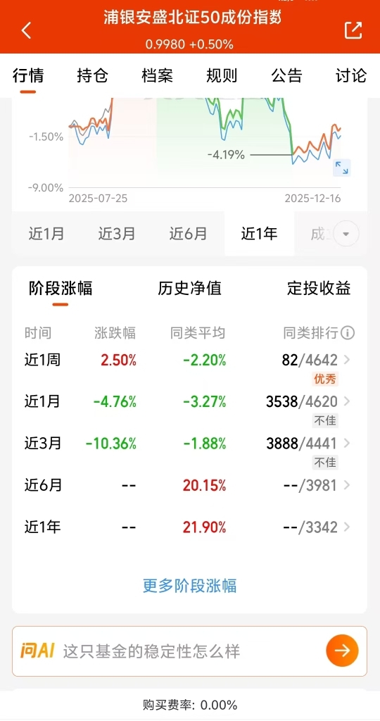 浦银北证50成立以来跑赢指数有超额,费率低不限额,7天免赎回费,值得拥有$浦银安