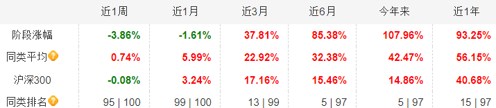 近一年大涨93.26%,跑赢同类平均超38%;今年来飙升107.96%,跑赢同类平均超65%,市场排名第5.